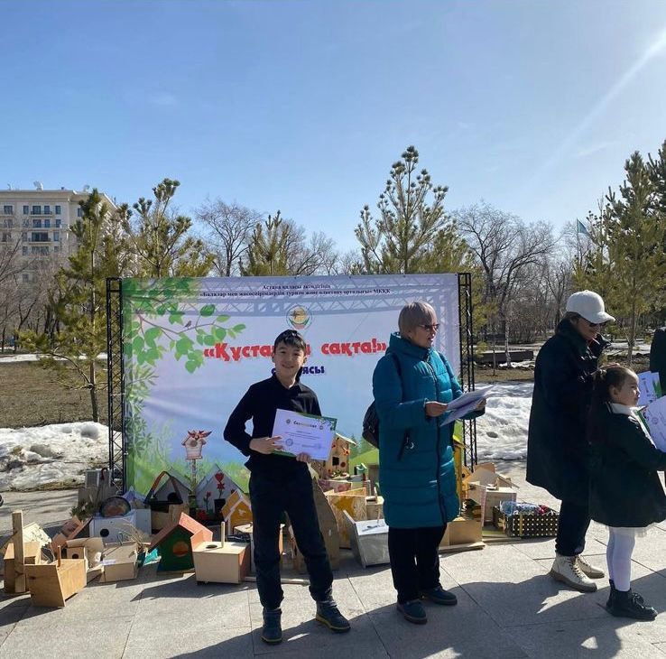 Астана қаласы әкімдігінің «Балалар мен жасөспірімдердің туризм және өлкетану орталығы» және «Қазақстанның экологиялық қоры» ҚҚ бірлесуімен 5 сәуір күні Астаналық Орталық саябақта өткен «Құстарды сақта!» акциясы өтті. Акцияның мақсаты: экологиялық мәдениет негіздерін тәрбиелеу, табиғатқа танымдық қызығушылықты дамыту. Акцияға 50-ден астам оқушы қатысты. Балалар әкелген ұяларын неден жасағандығын, қандай құстарға арналғанын, қандай жем салуға болатындығы туралы айтып берді. Акция қорытындысында саябаққа бірнеше ұя ілініп, жем салынды.Акцияға мектебіміздің оқушылары да қатысып жүлделі орындарға ие болды.
