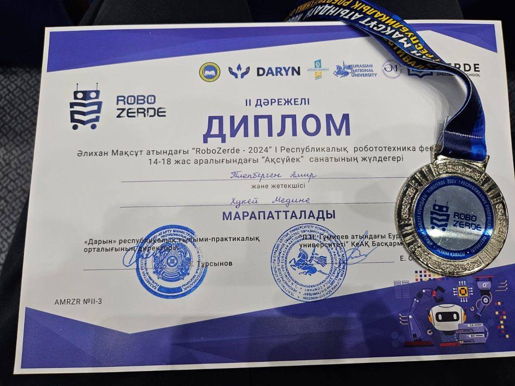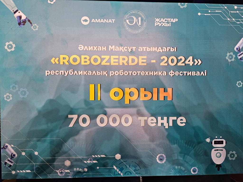 «Астана дарыны» дарынды балалар мен талантты жастарды анықтау және қолдау орталығының ұйымдастыруымен өткен Әлихан Мақсұт атындағы “RoboZerde-2024” республикалық робототехника фестиваліне қатысып жүлделі 2-орынды және 70 000 теңгенің сертификатын иеленген оқушыларымыз Тлепберген Амир мен Жұпарбай Ғаниді және жетекшісі Хухей Мединені жеңісімен құттықтаймыз!