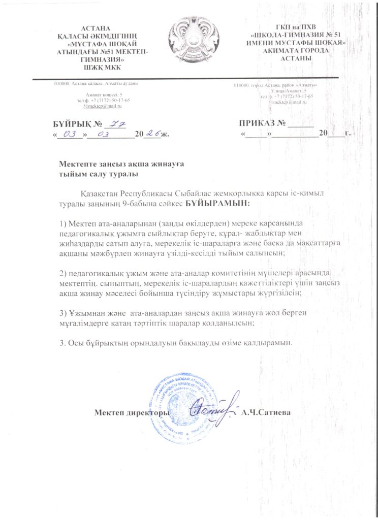 Астана қаласы әкімдігінің "Мұстафа Шоқай атындағы № 51 мектеп-гимназия" ШЖҚ МКК